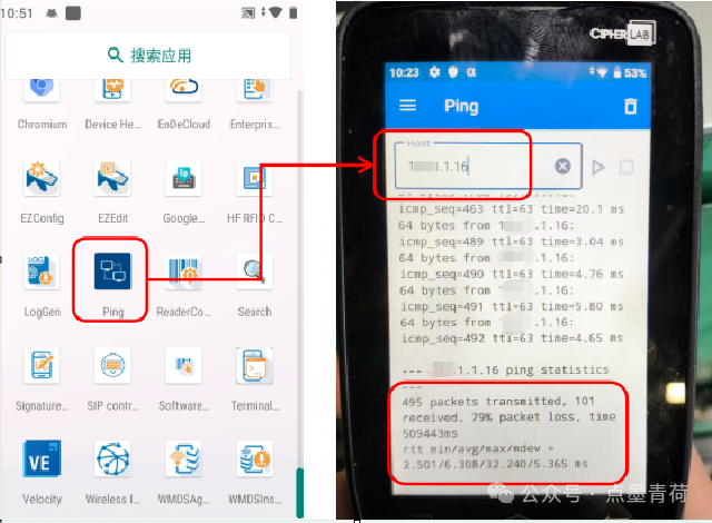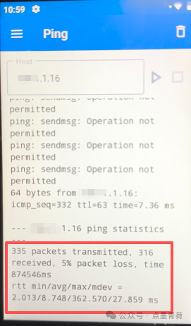 问客户要了一下服务器的 IP 地址,在 PDA 上 ping 了一下服务器 IP 地址,就发现问题了,如下图,有问题的 PDA,丢包率 79%,而员工正常使用的 PDA,丢包率 5%,这就很不正常了,怀疑是 IP 地址冲突了。